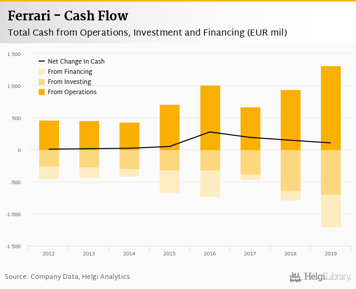 Ferrari's operating cash flow stood at EUR 1,306 mil in 2019, up 39.8% when compared to the previous year. Historically, between 2012 - 2019, the firm’s operating cash flow reached a high of EUR 1,306 mil in 2019 and a low of EUR 426 mil in 2014.