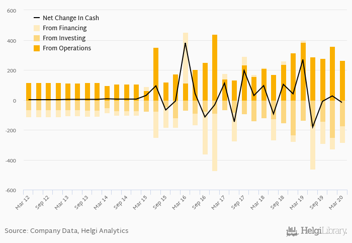 Cash from financing amounted to EUR -109 mil, so the company generated EUR -17.6 mil net cash in 1Q2020.