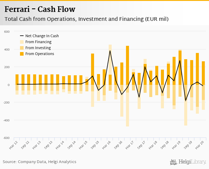 At the end of 1Q2020, the company had a net debt of EUR 1,261 mil, or 0.989x of EBITDA and 82.1% of equity. Net working capital amounted to EUR 3.26 mil, or 0.350% of sales. The cash conversion cycle stood at -27.3 days in 1Q2020. This is an improvement compared to the previous year (-28.6 days), so Ferrari’s working capital was tied up for 1.26 fewer days.