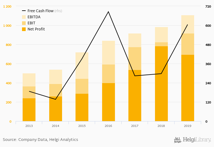 On the operating level, EBITDA reached EUR 1,109 mil, up 12.8% compared to the previous year. Over the last five years, the company's EBITDA has risen 15.5% a year on average.