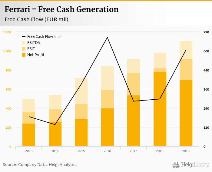 Ferrari made a net profit of EUR 696 mil with revenues of EUR 3,767 mil in 2019, down by 11.3% and up by 10.1%, respectively, compared to the previous year. This translates into a net margin of 18.5%.