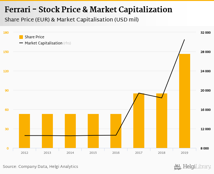 Ferrari stock traded at EUR 147 per share at the end 2019 implying a market capitalization of USD 30,505 mil.