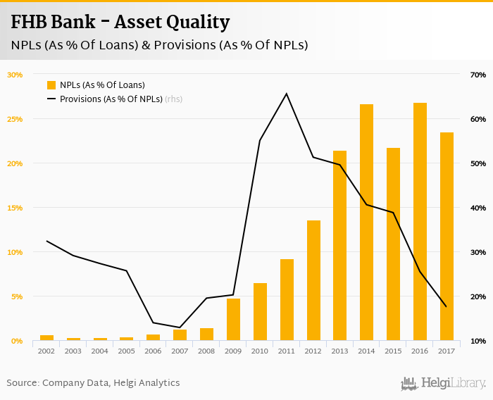 FHB Bank's non-performing loans reached 23.5% of total loans at the end of 2017, down from 26.8% compared to the previous year. Historically, the NPL ratio hit an all time high of 26.8% in 2016 and an all time low of 0.278% in 2003.