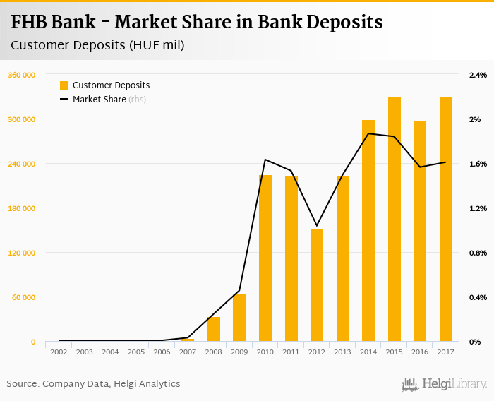 FHB Bank accounted for 1.61% of all customer deposits taken by banks in Hungary at the end of 2017. Historically, the bank’s market share in customer deposits reached an all time high of 1.87% in 2014 and an all time low of 0% in 2002.
