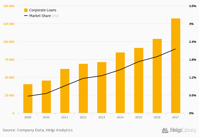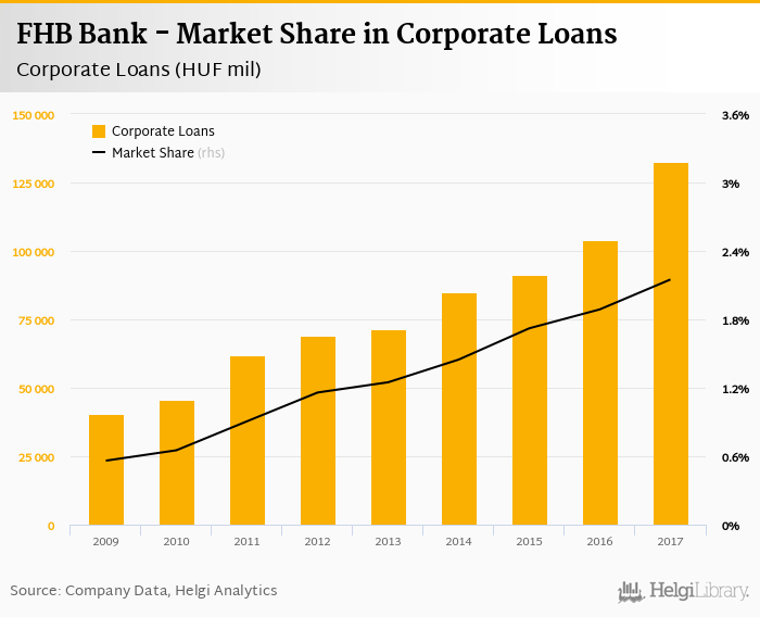 FHB Bank accounted for 2.15% of all corporate loans issued in Hungary at the end of 2017. Historically, the bank’s market share in corporate loans reached an all time high of 2.15% in 2017 and an all time low of 0.561% in 2009.