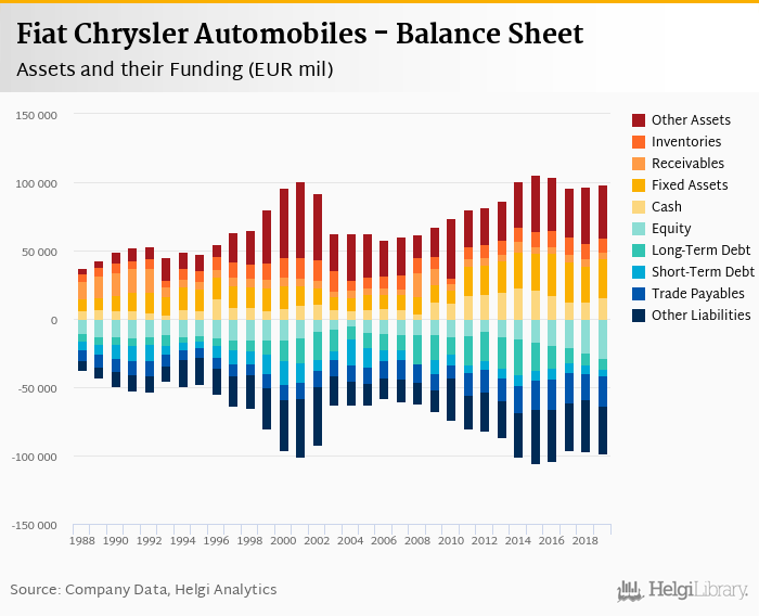 Fiat Chrysler Automobiles's total assets reached EUR 98,044 mil at the end of 2019, up 1.21% compared to the previous year.