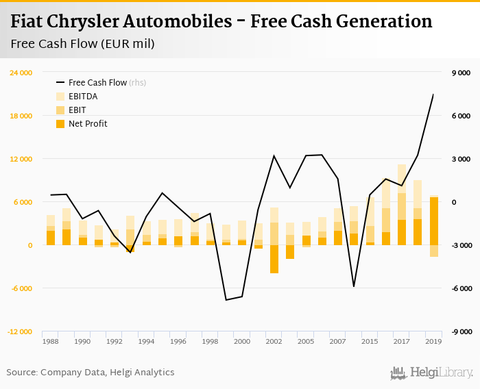 Fiat Chrysler Automobiles made a net profit of EUR 6,622 mil with revenues of EUR 108,187 mil in 2019, up by 83.5% and down by 2.02%, respectively, compared to the previous year. This translates into a net margin of 6.12%.