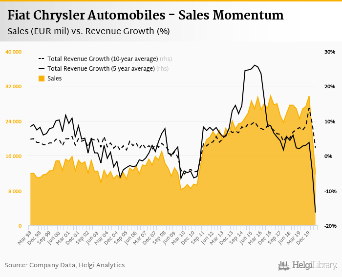 Fiat Chrysler Automobiles generated sales of EUR 11,707 mil in 2Q2020, down 56.2% compared to the previous year. Historically, between 1Q1988 and 2Q2020, the company’s sales reached a high of EUR 29,719 mil in 4Q2016 and a low of EUR 7,394 mil in 4Q1993.