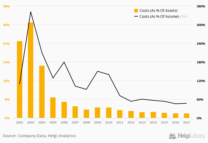 Historically, the bank’s costs reached an all time high of 341% of income in 2003 and an all time low of 45.2% in 2016.