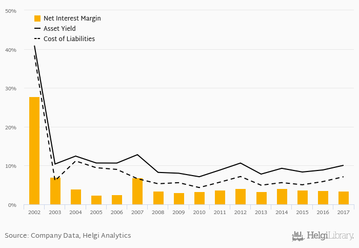 Historically, the bank’s net interest margin reached an all time high of 27.8% in 2002 and an all time low of 2.35% in 2005. The average margin in the last five years amounted to 3.62%.