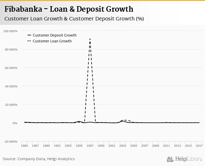 Fibabanka's customer loan growth reached 27.0% in 2017, down from 32.8% compared to the previous year. Historically, the bank’s loans growth reached an all time high of 91,300% in 1997 and an all time low of -99.8% in 1996. In the last decade, the average annual loan growth amounted to 34.7%.
