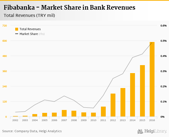 As a result, Fibabanka accounted for 0.488% of all bank revenues generated by banks in Turkey in 2016. Historically, the bank’s market share in total revenues reached an all time high of 0.488% in 2016 and an all time low of 0.029% in 2002.