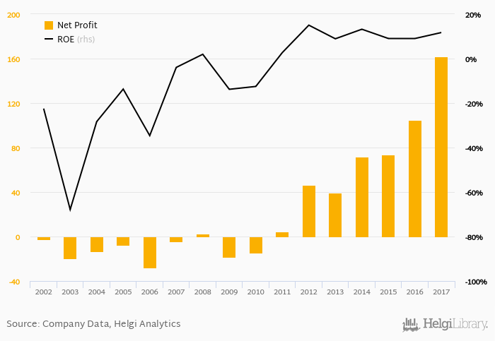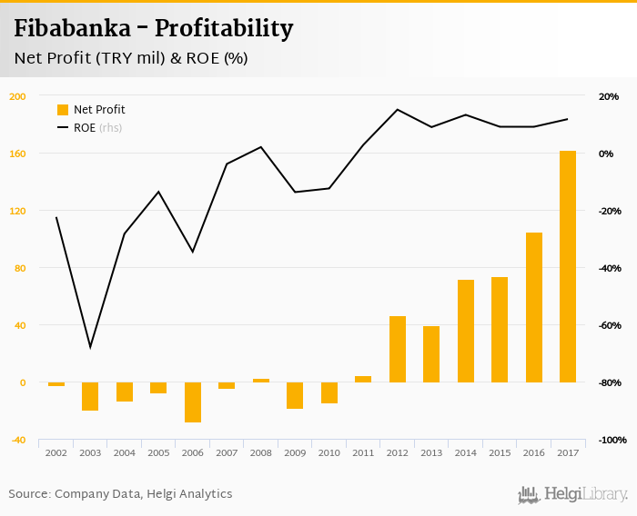 Fibabanka made a net profit of TRY 162 mil in 2017, up 54.0% compared to the previous year. This implies a return on equity of 11.7%.