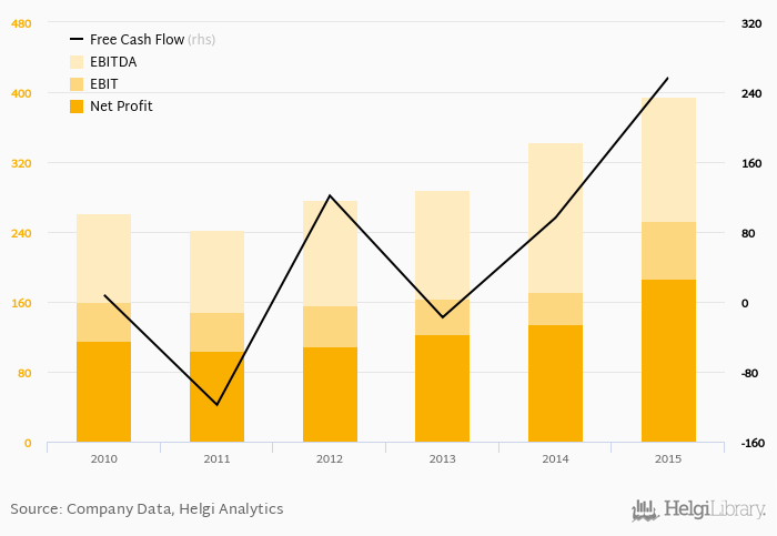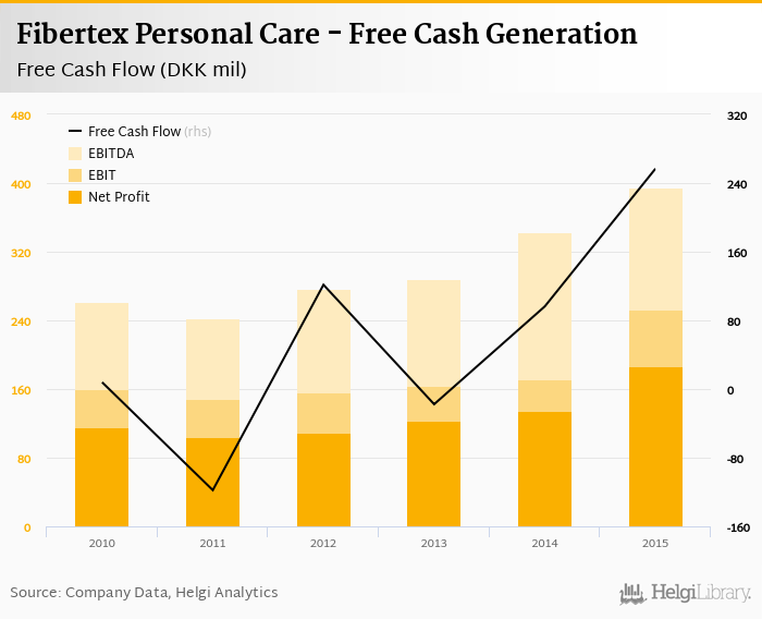 Fibertex Personal Care made a net profit of DKK 187 mil with revenues of DKK 1,797 mil in 2015, up by 38.8% and up by 0.543%, respectively, compared to the previous year. This translates into a net margin of 10.4%.