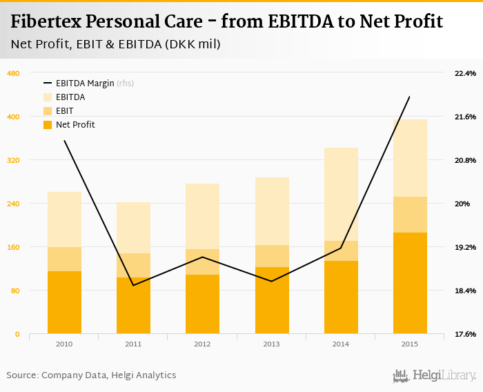 Fibertex Personal Care made a net profit of DKK 187 mil with revenues of DKK 1,797 mil in 2015, up by 38.8% and up by 0.543%, respectively, compared to the previous year. This translates into a net margin of 10.4%.