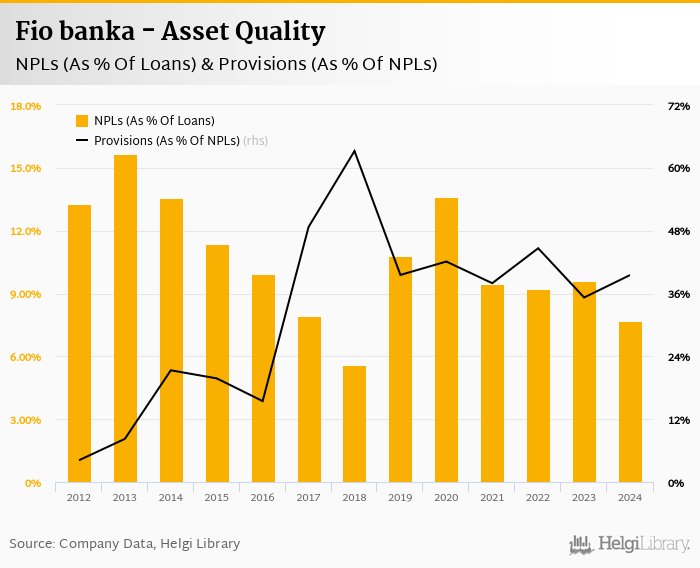 Fio banka's non-performing loans reached 7.67% of total loans at the end of 2024, down from 9.58% compared to the previous year. Historically, the NPL ratio hit an all time high of 15.7% in 2013 and an all time low of 5.59% in 2018.