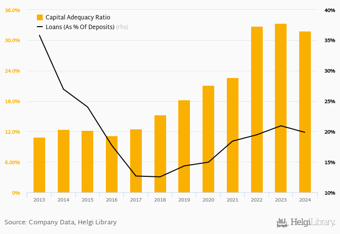 The Tier 1 ratio amounted to 31.8% at the end of 2024, down from 33.3% compared to a year earlier.