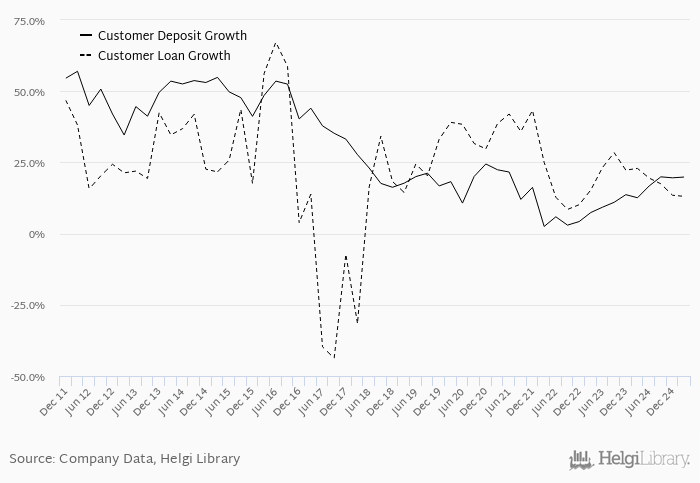 On the other hand, bank's customer deposit growth amounted to 19.9% at the end of 2025-03-31, up from 12.6% when compared to the previous year. Historically, the bank’s deposit growth reached an all time high of 57.0% in 2012-03-31 and an all time low of 2.51% in 2022-03-31. In the last decade, the average annual loan growth amounted to 21.3%.