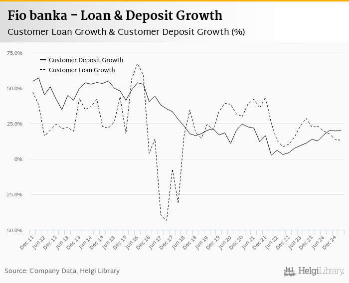 Fio banka's customer loan growth reached 13.1% in 2025-03-31, down from 22.9% compared to the previous year. Historically, the bank’s loans growth reached an all time high of 67.2% in 2016-06-30 and an all time low of -43.8% in 2017-09-30. In the last decade, the average annual loan growth amounted to 18.3%.