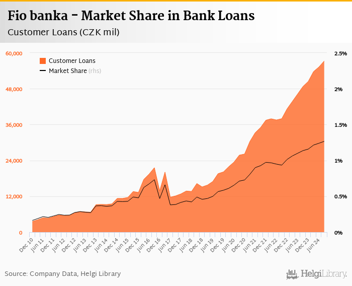 Fio banka's customer loans reached CZK 57,278 mil in 2024-09-30, up 3.63% compared to the previous year.