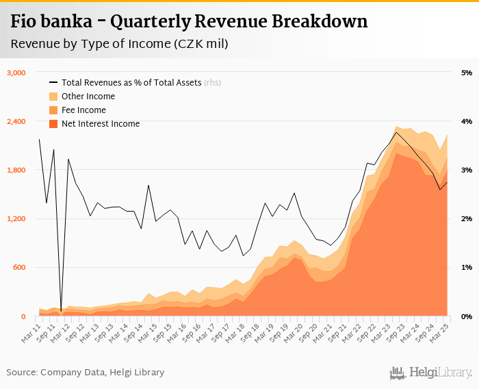 Fio banka generated total banking revenues of CZK 2,224 mil in the first quarter of 2025, down 0.44% when compared to the same period of last year and up 9.6% when compared to the previous quarter.