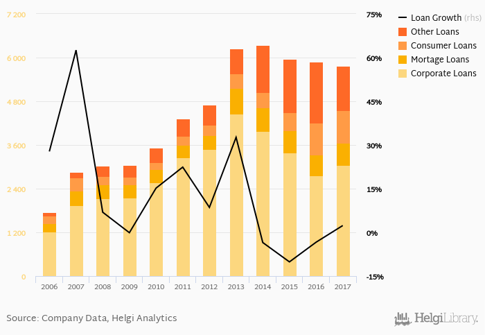 Mortgage loans represented 10.8% of the bank's loan book at the end of the year 2017, consumer further 15.6% and corporate loans 52.8% of total loans.