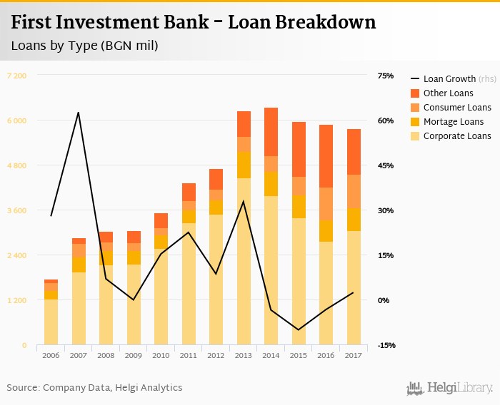 First Investment Bank's loans reached BGN 5,765 mil in the 2017, down from BGN 5,879 mil compared to the previous year. Historically, the bank’s loans reached an all time high of BGN 6,334 mil in 2014 and an all time low of BGN 1,755 mil in 2006.
