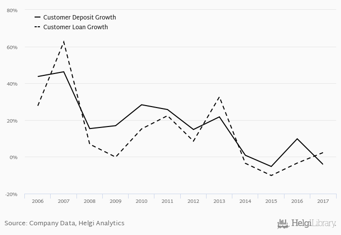 On the other hand, bank's customer deposit growth amounted to -4.15% at the end of 2017, down from 9.83% when compared to the previous year. Historically, the bank’s deposit growth reached an all time high of 46.3% in 2007 and an all time low of -5.23% in 2015. In the last decade, the average annual loan growth amounted to 11.8%.