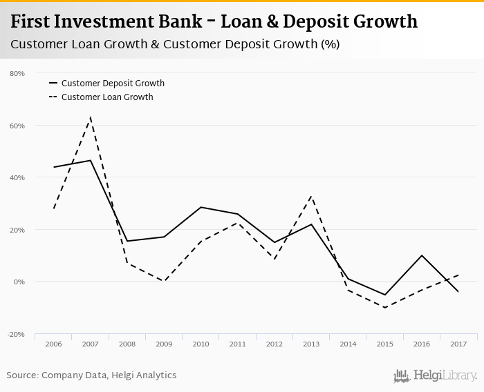 First Investment Bank's customer loan growth reached 2.34% in 2017, up from -3.38% compared to the previous year. Historically, the bank’s loans growth reached an all time high of 62.5% in 2007 and an all time low of -10.1% in 2015. In the last decade, the average annual loan growth amounted to 6.39%.