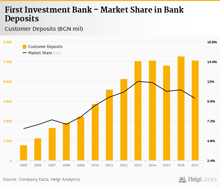 First Investment Bank accounted for 9.91% of all customer deposits taken by banks in Bulgaria at the end of 2017. Historically, the bank’s market share in customer deposits reached an all time high of 12.0% in 2013 and an all time low of 6.24% in 2005.
