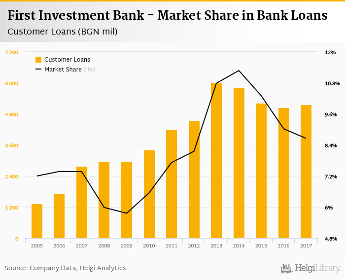 First Investment Bank accounted for 8.65% of all customer loans issued in Bulgaria at the end of 2017. Historically, the bank’s market share in customer loans reached an all time high of 11.3% in 2014 and an all time low of 5.76% in 2009.