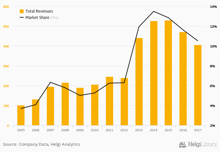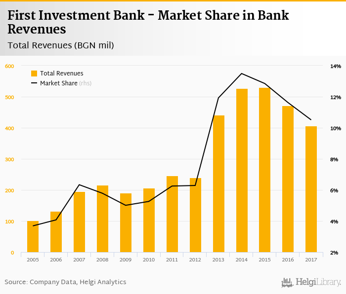 As a result, First Investment Bank accounted for 10.5% of all bank revenues generated by banks in Bulgaria in 2017. Historically, the bank’s market share in total revenues reached an all time high of 13.5% in 2014 and an all time low of 3.69% in 2005.