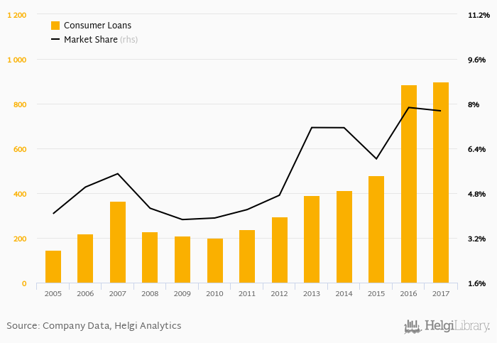 First Investment Bank accounted for 7.74% of all consumer loans issued in Bulgaria at the end of 2017. Historically, the bank’s market share in consumer loans reached an all time high of 7.86% in 2016 and an all time low of 3.86% in 2009.