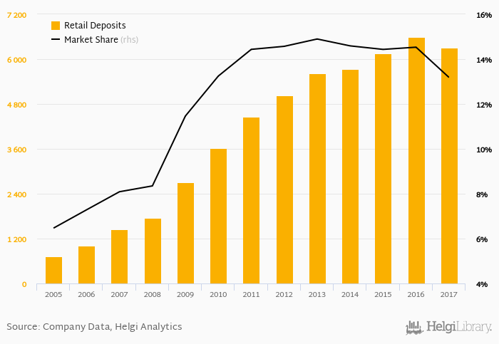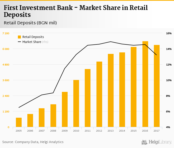 First Investment Bank accounted for 13.2% of all retail deposits taken by banks in Bulgaria at the end of 2017. Historically, the bank’s market share in retail deposits reached an all time high of 14.9% in 2013 and an all time low of 6.47% in 2005.
