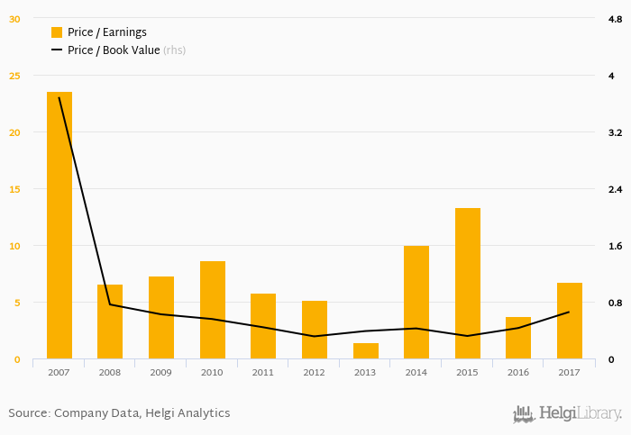 In terms of price to book value, the stock reached 0.657x at the end of 2017. Since 2012, the multiple reached an all time high of 0.657x in 2017 and an all time low of 0.317x in 2015 with an average of 0.443x.