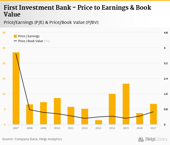 First Investment Bank stock traded at BGN 5.66 per share at the end 2017 implying a market capitalization of USD 382 mil.