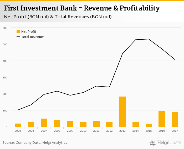 Comparing First Investment Bank with its closest peers, DSK Bank generated a net profit of BGN 285 mil with revenues of BGN 715 mil in 2017, United Bulgarian Bank netted BGN -47.4 mil (revenues of BGN 346 mil) and Raiffeisenbank Bulgaria announced a net profit of BGN 137 mil (revenues of BGN 314 mil).