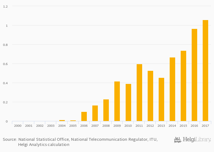 Historically, fixed broadband internet lines per household in Zambia reached an all time high of 1.06% in 2017 and an all time low of 0.001% in 2000.