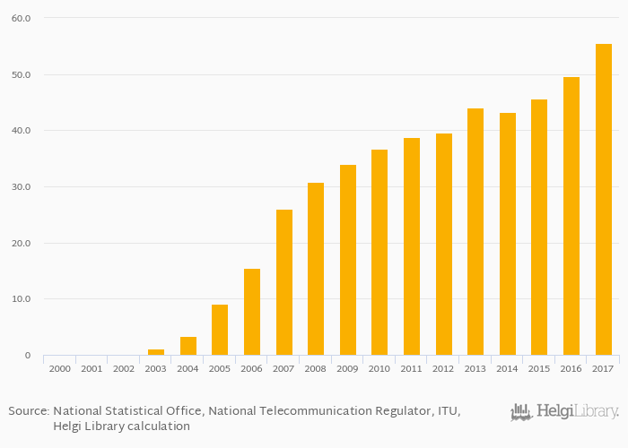 Fixed broadband internet lines per household rose 11.9% to 55.6% in Turkey in 2017, according to World Bank.