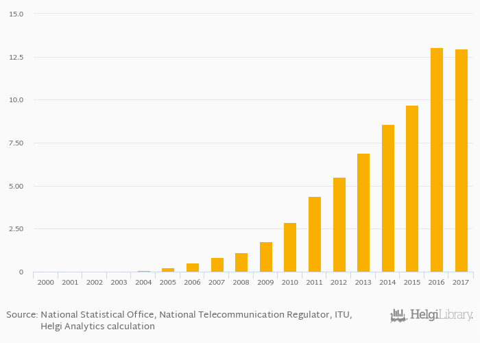 Historically, fixed broadband internet penetration based on connections as a percentage of population in Suriname reached an all time high of 13.0% in 2016 and an all time low of 0% in 2000. When compared to Suriname's main peers, fixed broadband internet penetration based on connections as a percentage of population in Brazil amounted to 14.1%, 8.08% in Guyana, 24.6% in Trinidad and Tobago and 8.24% in Venezuela in 2017.