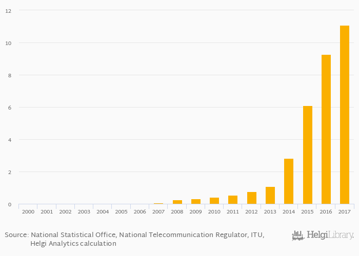 Fixed broadband internet penetration based on connections as a percentage of population rose 19.8% to 11.1% in Uzbekistan in 2017, according to World Bank.