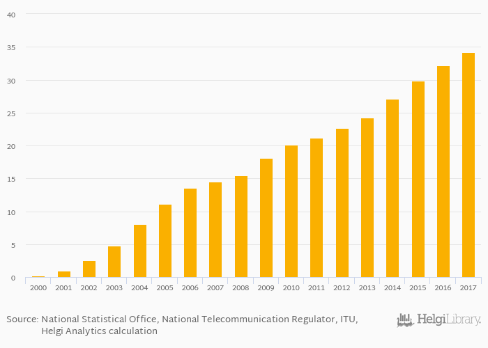 Fixed broadband internet penetration based on connections as a percentage of population rose 6.17% to 34.1% in Portugal in 2017, according to World Bank.