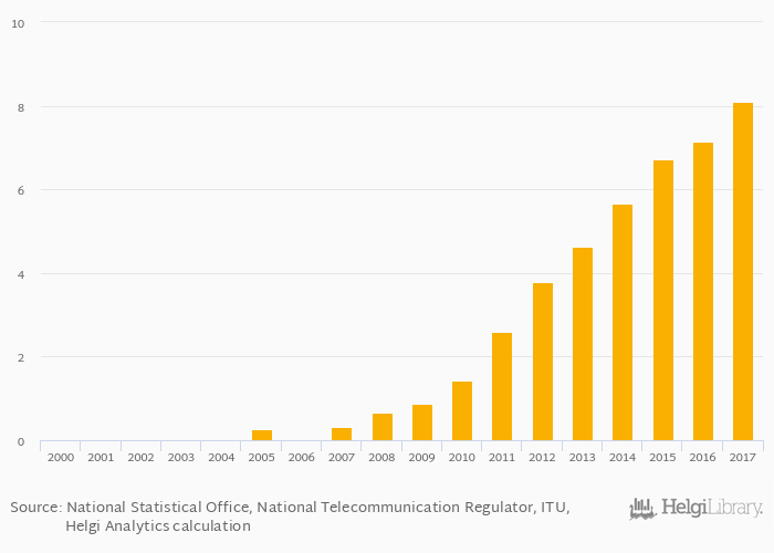 Fixed broadband internet penetration based on connections as a percentage of population rose 13.3% to 8.08% in Guyana in 2017, according to World Bank.