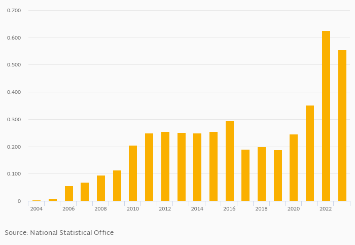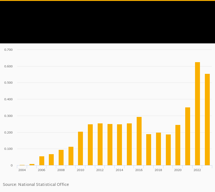 Historically, fixed broadband internet penetration based on subscribers as a percentage of population in Ghana reached an all time high of 0.625% in 2022 and an all time low of 0.004% in 2004. When compared to Ghana's main peers, fixed broadband internet penetration based on subscribers as a percentage of population in Benin amounted to 0.171%, 1.36% in Ivory Coast and 1.23% in Togo in 2023.
