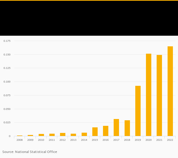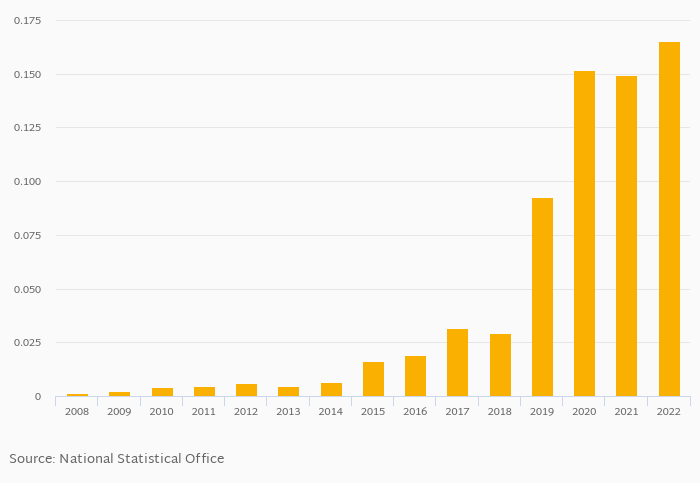 Fixed broadband internet penetration based on subscribers as a percentage of population rose 10.8% to 0.165% in Eritrea in 2022, according to World Bank.