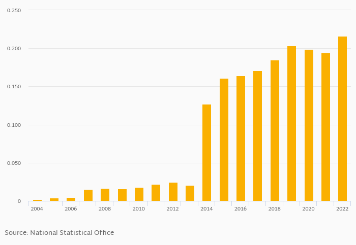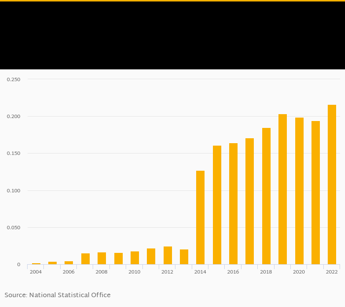 Fixed broadband internet penetration based on subscribers as a percentage of population rose 11.2% to 0.216% in Gambia in 2022, according to World Bank.