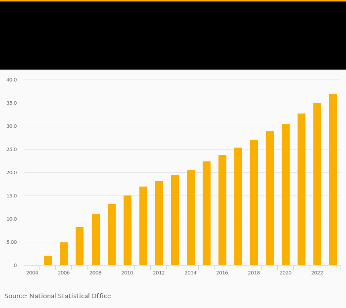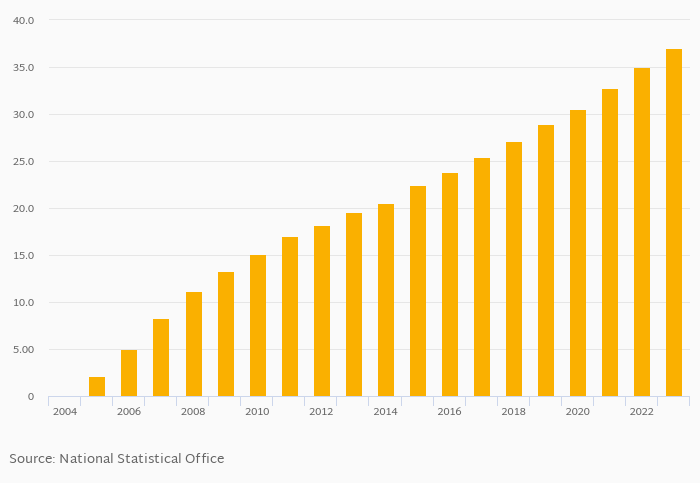 Fixed broadband internet penetration based on subscribers as a percentage of population rose 5.88% to 37.0% in Bulgaria in 2023, according to World Bank.