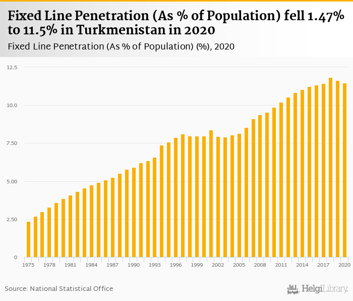 Fixed line penetration as a percentage of population fell 1.47% to 11.5% in Turkmenistan in 2020, according to World Bank.