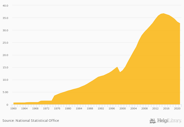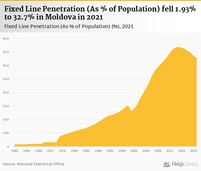 Fixed line penetration as a percentage of population fell 1.93% to 32.7% in Moldova in 2021, according to World Bank.