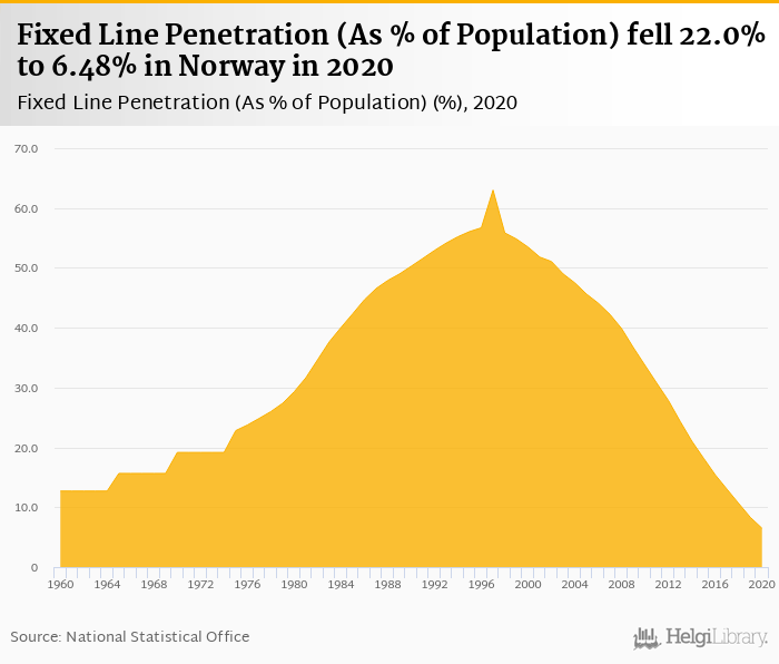 Fixed line penetration as a percentage of population fell 22.0% to 6.48% in Norway in 2020, according to World Bank.